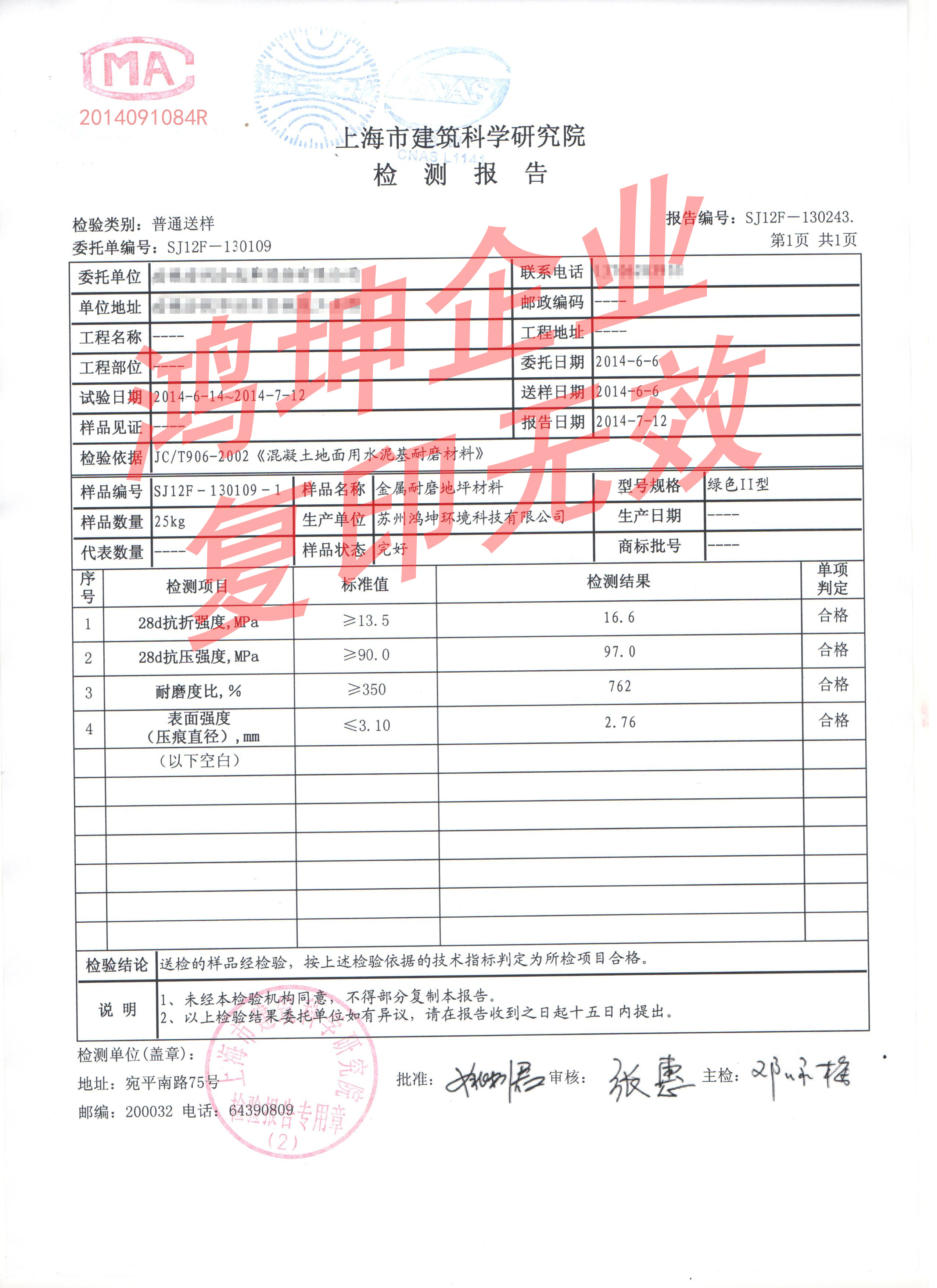 最近經常有客戶咨詢耐磨地坪的硬度怎么確定,有沒有達到標準,這些鴻坤都是有檢測報告的,關于耐磨地坪的抗折強度和抗壓強度等性能。