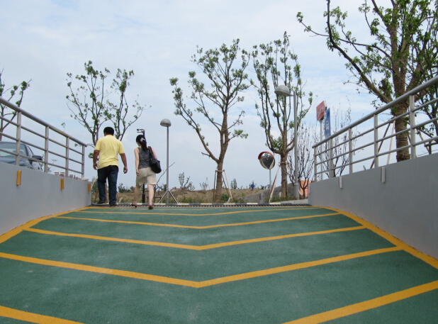 5.4施工方法:將抗壓層材料根據要求配比、充分攪拌后,用鋸齒鏝刀均勻、平整、密實的攤鋪在抗壓層上,然后再噴涂一遍,形成約4㎜厚表面粗糙的彩色條形止滑帶。