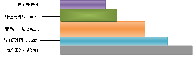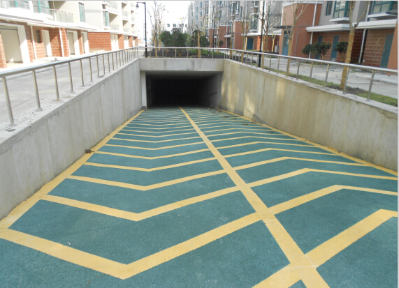 a)將鴻坤車(chē)道樹(shù)脂(HK-W11A)、車(chē)道骨料(HK-W11C)根據(jù)要求配比、充分?jǐn)嚢韬?用鋸齒鏝刀均勻、平整密實(shí)的攤鋪在抗壓層上,然后再噴涂一遍,形成4㎜厚,表面粗糙的彩色條形止滑帶