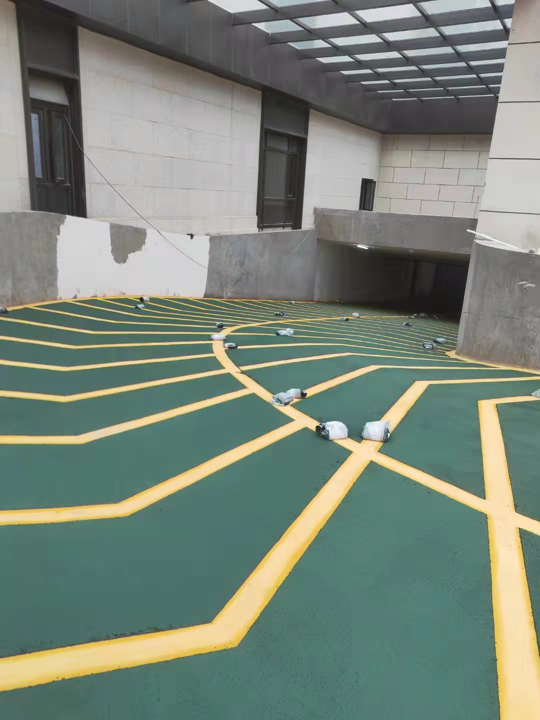 無震動防滑坡道材料抗壓層施工結束后粘貼美紋紙,間隔有80-100cm左右,具體按實際情況測量平均分。美紋紙貼好以后再表面批刮止滑層,止滑層的顏色有綠色或者灰色。表面做好之后用滾筒拉毛,增加表面的防滑效果。