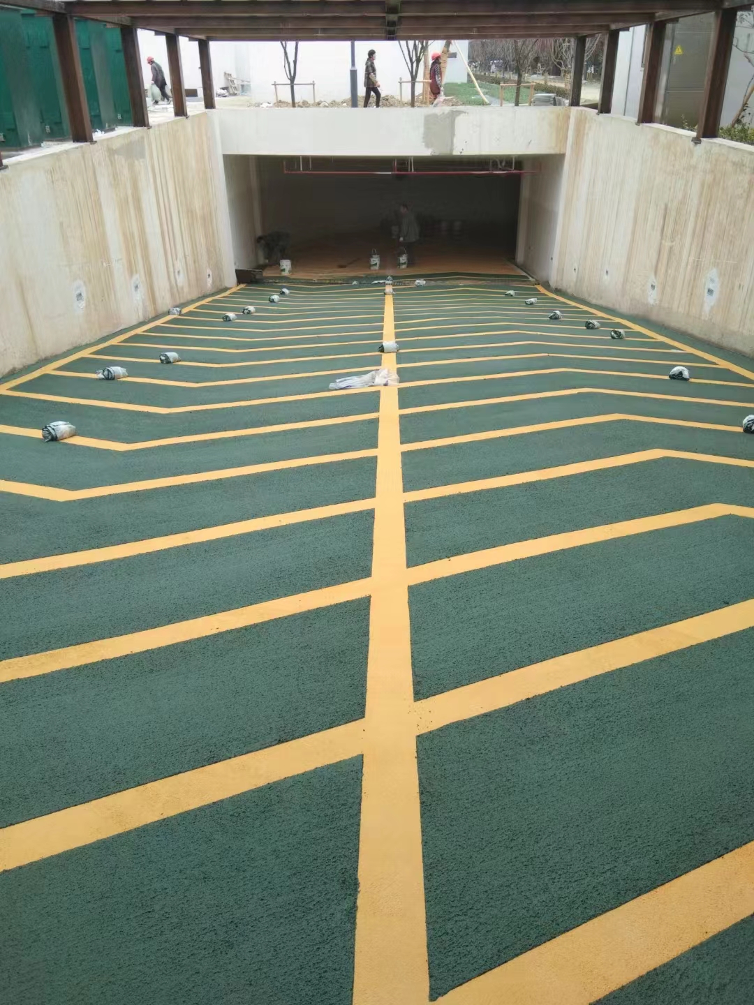 防滑坡道材料一般分為坡道骨科和水性樹脂兩種材料,將兩種材料按配比攪拌均勻后批刮在地面上,材料用量要把握好,一般黃色抗壓層在2mm左右,綠色止滑層在3mm左右,施工簡單方便,防滑效果好。