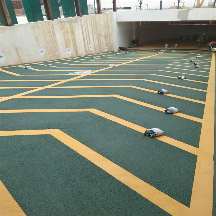 鴻坤防滑坡道材料屬于聚合物砂漿材料,水性環保,施工簡單,施工人員和使用人員都很友好。無震動防滑坡道施工分為打底、批刮黃色抗壓層、貼美紋紙、批刮綠色止滑層和罩面幾個步驟,整體厚度在5-6mm左右,表面的粗糙顆粒形成一定的防滑效果,不僅有安全防滑的功能,還有導向箭頭,對車輛行駛有引導作用。