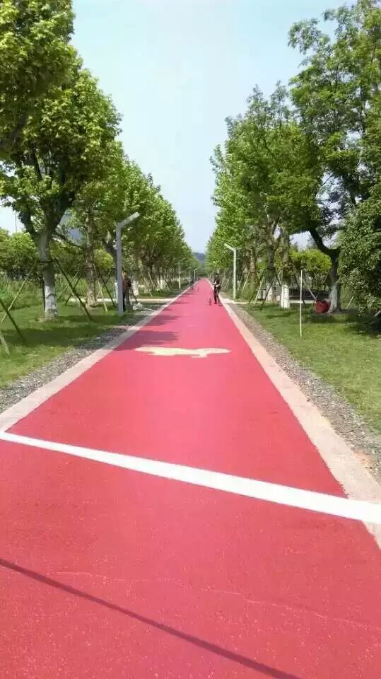 人行步道彩色路面施工簡單,根據厚度要求確定用量,材料用量確定后開始施工。綠道樹脂批刮過程中滿撒彩色骨料,干燥后噴灑罩面劑即可。