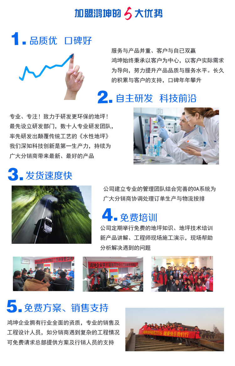 地坪行業(yè)的光明前景,吸引了全國3000多家地坪企業(yè)競爭角逐,而上規(guī)模和有實力的企業(yè)卻屈指可數。鴻坤地坪首先順應行業(yè)的發(fā)展趨勢及國內環(huán)境的需要,率先研發(fā)并推出行業(yè)更佳的水性地坪,目前已在水性市場占據重要位置,廣受市場歡迎。加盟鴻坤地坪將是您明智的選擇!選擇鴻坤,改變未來!